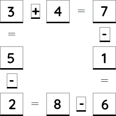 Комментарий: В четыре маленькие пустые клетки нужно поставить знак + или −. Цифры нужно вписывать в восемь больших пустых клеток. Вычитания производятся сверху вниз и слева направо!