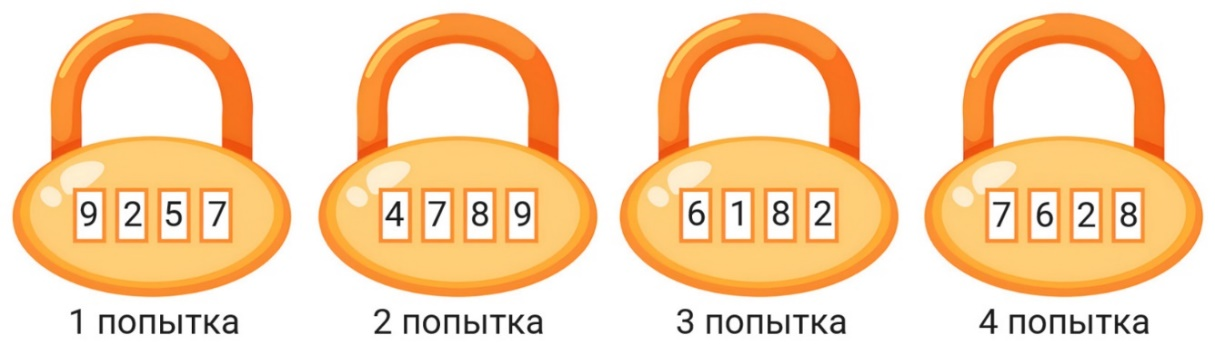 ответСаша забыл код от велосипедного замка, который состоит из четырёх различных цифр. Он совершил четыре попытки набрать код, при этом замок не открылся.