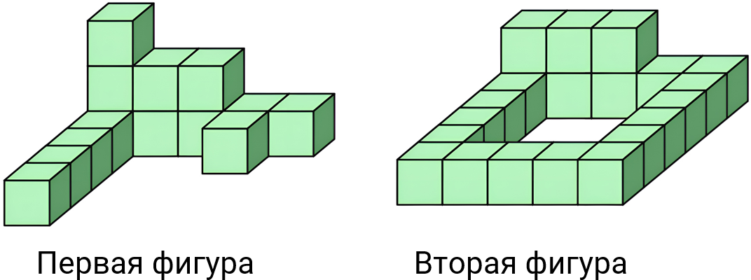 ответЯша сложил две фигуры из кубиков, как показано на рисунке. В общей сложности он использовал 35 кубиков. Чтобы окрасить поверхность первой фигуры (включая поверхность, которая соприкасается с полом), Яша использовал 162 грамма краски.